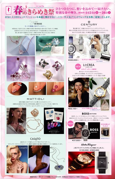 皆様、いつも大変お世話になっております。日ごとに春の訪れを感じる今日この頃、いかがお過ごしでしょうか。皆様に心躍るお知らせがございます。来る4月24日(水)より、待ちに待った「春のきらめき祭」を開催することになりました! 24日より26日の3日間は、ブランドジュエリーをはじめ、時計や特価商品もございますので、ぜひ、お出かけください。皆様のお越しをお待ちいたしております。